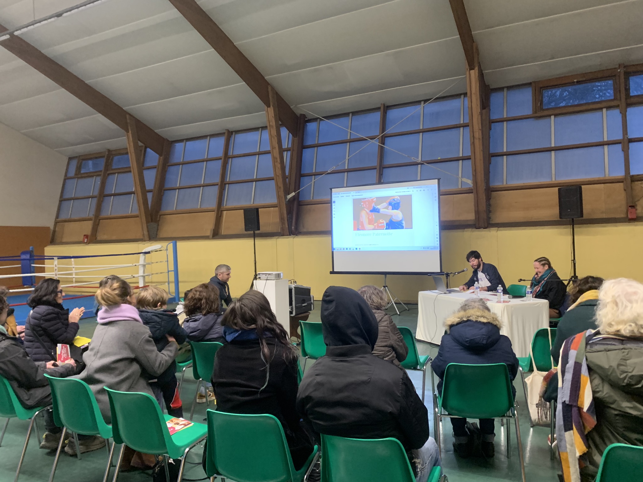 Nous sommes le vendredi 8 mars 2024 dans la salle de boxe Maryvonne Caillère à Fougères, journée internationale des droits des femmes. Dans l’après-midi, des initiations à la boxe anglaise (avec goûter et discussion art et sport) ont été proposés à de jeunes volontaires. En début de soirée, dans une atmosphère rafraîchissante, Eléonore a mené une performance médita-neuromusculaire sur ring qui a plongé nos participantes et nos participants dans un temps suspendu. Invitée par la suite à discuter de son travail, Eléonore a partagé avec justesse les liens qu’elle a tissés entre expérience sportive de haut niveau, sculpture et performance.